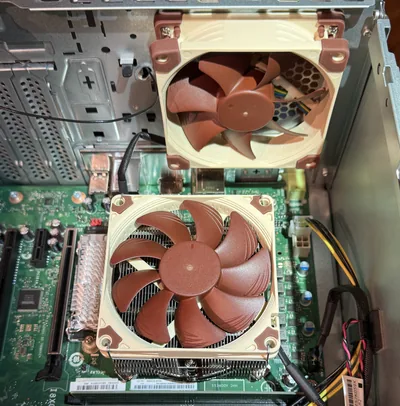 I selected the Noctua NH-L9x65 as a replacement, a low-profile cooler from a company renowned for its build quality and low-noise designs. With a height of 65 mm the Noctua easily fits into the ThinkCentre (with lots of headroom to spare).