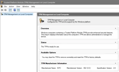 Open the Windows MMC snap-in tpm.msc. If your machine’s TPM is enabled it should look similar to the following: