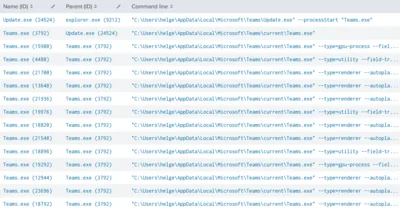 As we can see in the screenshot above, the main Teams.exe process doesn’t have any command line arguments. The helper processes, on the other hand, all have a --type= argument.
