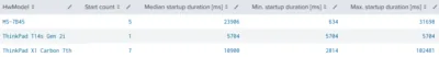 Results: Teams Start Duration and Start Count Grouped by Hardware Model