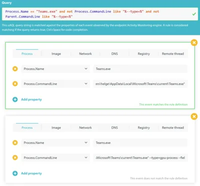 This technique makes use of the observed behavior that the command line of Teams helper processes contains a --type= parameter, whereas the main Teams process’ command line does not contain such a parameter.
