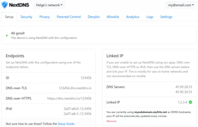 DNS is a stateless protocol. There is no authentication built-in. Nevertheless, NextDNS needs some way to identify which of the millions of queries arriving at its servers originate from your network in order to apply your customized configuration. If you cannot use DoT (which Fritz!Boxes support as of Fritz!OS 7.20) or DoH, this only leaves your router’s public IP address as an identifiable element. Unless you have a business account, IP addresses change. NextDNS supports a clever alternative, though: it allows you to specify a dynamic DNS name, which makes it perfect for home networks.