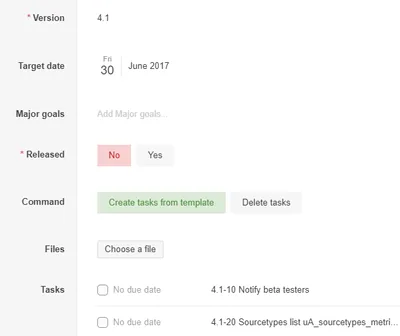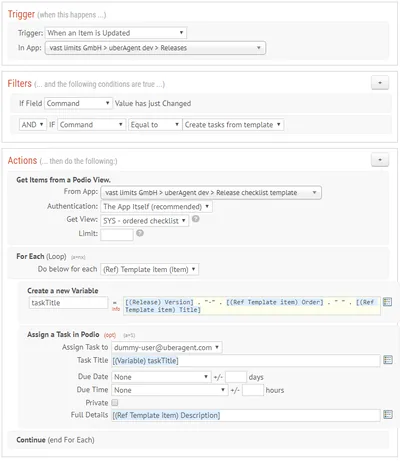When we run this workflow we have no idea who might later be responsible for each individual task. We cannot leave the field Assign task to empty, so we created a dummy user by inviting a dummy email address to the Podio workspace. Once we start working on the release it is easy to reassign tasks to team members.