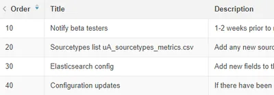 You might wonder about the first field, Order. Unfortunately Podio does not allow items to be reordered arbitrarily. That is why we need a numerical field to sort checklist items by. After all, this is a process, and the order of the items matters a great deal. The actual content looks like this: