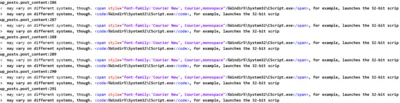 I started thinking about how to search and replace HTML tags in WordPress when I found an older post where expressions were formatted with inline styling like the following: <span style="font-family:'Courier New',Courier,monospace;">. I had migrated to the much more modern <code> tag a long time ago. Seeing that I still had legacy code formatting was a bit of a shock. Apparently, I had overlooked some styling bits in the migration. How many posts might be affected?