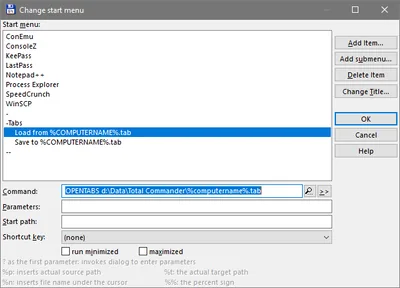 - Item 1 command: OPENTABS d:\Data\Total Commander%COMPUTERNAME%.tab