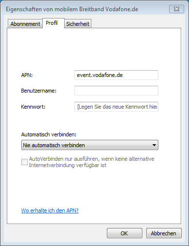 Right-clicking the connection gets us to the properties dialog, where the APN has already been set automatically. User name and password are not required: