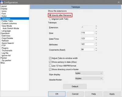 In the Tabstops section, configure file extensions to be displayed directly after the filename. The default looks just too weird.