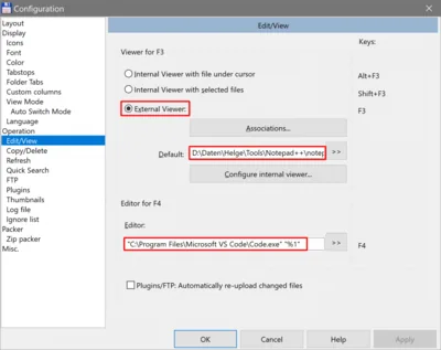 In the Edit/View section, configure your editor(s) of choice. Total Commander comes with a built-in viewer, but you almost certainly want to replace it with something else. As you can see in the screenshot, I am using Notepad++ as “viewer” (accessible via F3) and Visual Studio Code as “editor” (accessible via F4). That allows me to bring up any (!) file in any of the two editors by pressing a single function key.