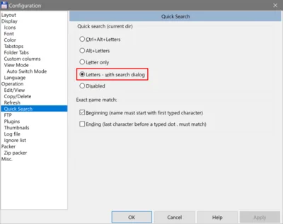 In the Quick Search section, let Total Commander know that you want to be able to select files or directories by typing the first few characters of their names.
