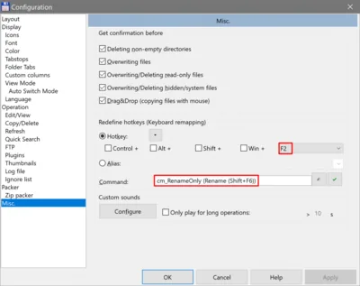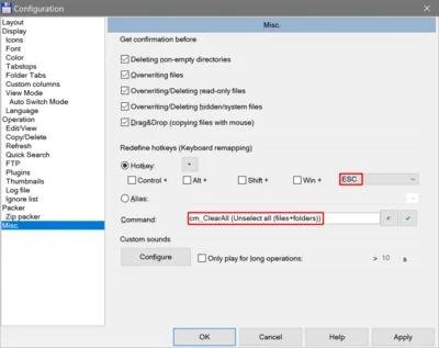In the Misc. section, we are going to spend a bit of time. It allows us to redefine (or configure new) hotkeys. Total Commander comes with a very extensive set of default keyboard shortcuts already, but nevertheless, I find some alterations and extensions necessary.
