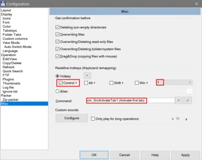 Finally, the best part: teach Total Commander to switch to the first tab when you press CTRL+1 (just like in your browser). Repeat this for CTRL+2, and so on: