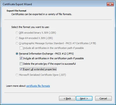 Check the export properties to include all certificates in the certification path and to export all extended properties: